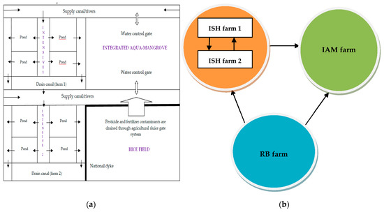 Farmers were asked about the serious problems related to their farming systems. Out of the responses, 90.47% of IAM and 77.78% of ISH culturists reported that their water intake was impaired in months in which pesticides were applied to their rice fields (March–April and August–September). The paddy fields were situated closely to the ISH farms and separated by a national dyke (10 m width) as visualized in the Figure 3a. Hoanhdong and Number 10 sluices belong to four drainage sluice system in five buffer communes of the XTNP. They are responsible for directly draining water from rice fields in the Giaothien commune to Tra and Vop rivers where provides intake brackish water for aquaculture. The statistics of the Giaothuy Irrigation limited company recorded that each sluice had dimensions of 4 m × 7 m (B × H) (B: width of the sluice; H: difference between river water level and canal design water level). Two of them covered a total of 1700 ha of drained area. Both of the two gates are controlled to open during pesticide application.