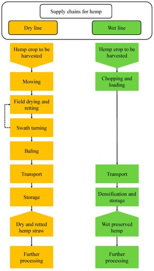 The background of this specific supply chain has been fundamental research activities on an alternative process chain for the utilization of hemp biomass for the manufacture of technical products, such as fiberboards, beginning from the late 1990s [40,47,48]. The key aspects of the research work were a reduction of the technical expenditure for harvesting and processing as well as a reduction of the harvest risk. Extensive investigations of the available harvesting technology have shown that conventional agricultural machinery typically used for fodder production can be used for harvesting hemp without significant modifications [48]. However, the weather risk is an essential aspect in the provision of hemp raw materials for traditional processing. Partially unfavorable weather conditions in the post-harvest period result in varying straw qualities and, in some cases, total losses [36,43,49].