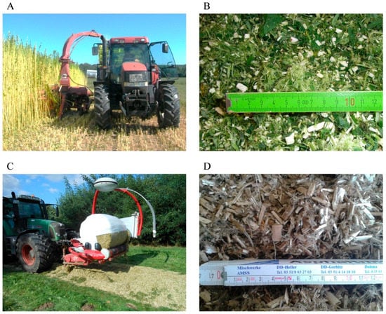 Following the growing season, hemp is harvested at different periods beginning from August until November. The preferred procedure has always been selected according to the corresponding task of the research project for the subsequent further processing of the raw material. The main focus within the two mentioned projects has been the harvest of the whole crop biomass using forage harvesters and its subsequent wet preservation (“ensiling”) [47] (Figure 2).