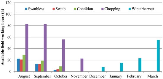 In contrast to the above-mentioned straw line, direct chopping from the plant stand and subsequent wet preservation might be an alternative for a quality preserving storage of fiber crops. The remarkable reduction of the weather-related procedure risk can be determined by the significantly higher number of available working hours in the usual harvest period. These are, based on modelling with site specific weather data, around 50–100% higher compared to the other harvesting procedures based on field drying [53] (Figure 3). Thus, the weather-related procedure risk is significantly reduced when chopping, and subsequent wet preservation of the harvest yield is applied.