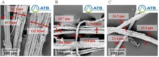 SEM images (10 kV) of fresh chopped hemp whole crop material (A), wet preserved hemp whole crop material after a 1-month storage period (B), and wet preserved hemp whole crop material after 3-months of storage (C); details for bast and fibrous elements.