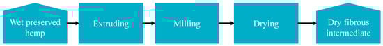 Its initial step to processing includes the technical possibility to mix different types of raw material as well as treatment with steam. Subsequently, the material is fed into a processing unit called a defibration extruder. The technical principle of the unit is comparable to widely used equipment in the plastic industry, where two screws transport and exposure the fed with mechanical energy in a defined process area. Mainly pressure, shear load, and to some extent temperature, enable the decomposition of the initial structure of the wet preserved hemp material. A defibration of the bast, fiber bundles and xylem (woody core) textures becomes possible due to the previous degradation of cell wall components in the course of wet preservation. While a slight reduction of the moisture content of the intermediate is possible already in this procedure step, it is subsequently further processed with a disc mill aiming at an additional reduction of the particle size as well as at an equalization of the particle size distribution (Figure 5). This is to some extent comparable to refining processes in the wood panel industry, even if atmospheric process conditions and a much higher DM content of the fed prevail here. Various operating parameters can be set in order to a) react to specific properties of the fed material; and/or b) influence the selected quality parameters of the resulting intermediate [74,82,83].