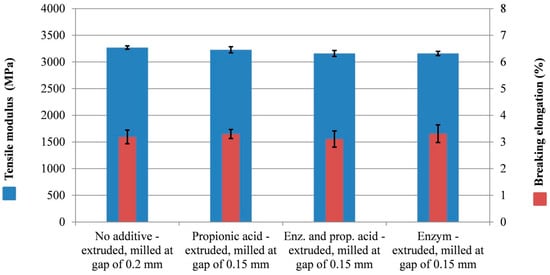 The addition of ensiling additives, either acid or biological, seems to have no significant influence on the tensile modulus of thermoplastic based composite test specimens. A slight decrease can be observed when a pure enzyme solution in combination with propionic acid is added to the stored raw material. In contrast, the trend of elongation at break is contrary, but also not on a significant level.