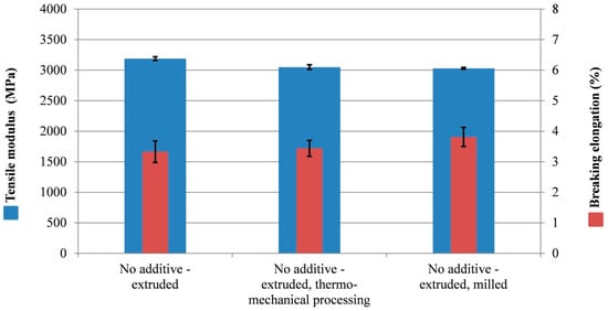 The values found for the tensile modulus of the test samples in both experimental series are in range or even above results of other investigations carried out using comparable polymer reinforcement procedures, such as the compounding of (modified) Polypropylene copolymer with 30% hemp fibers and subsequent injection molding [84,85,86,87].