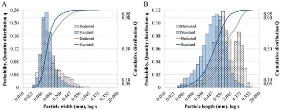 Evaluation of geometrical dimensions (A) width and (B) length of fibrous particles after processing, Futura 75 as well additional dedusting, resulting from an automated cumulative analysis of four scanned pictures (1200 dpi) using FibreShape.