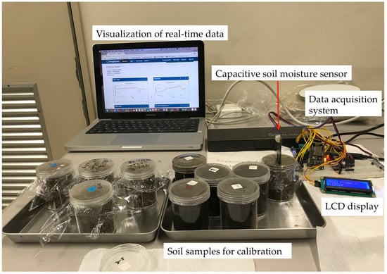 The data measured by the low-cost SKU:SEN0193 sensor and the temperature and humidity sensor were stored and visualized via an internet-based platform. The soil water contents predicted using the linear equation (which we developed by considering the raw counts of the sensor for bulk water and air with average values of 10,653 and 20,240, respectively) were inaccurate for both the organic-rich soil and the laboratory soil mixture. Hence, new calibration functions were developed by plotting the volumetric water content θ of the tested materials as a function of the raw count.