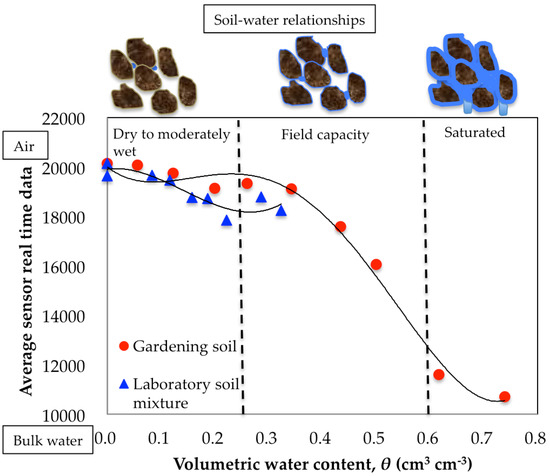 The average raw count of the two SKU:SEN0193 sensors was obtained for each moisture-adjusted sample. Soil moisture, temperature, and humidity data were recorded at intervals of 1 min. After the equilibrium, the data were recorded over 15–20 min for each sample (n = 15–20). The averaged raw count as a function of volumetric water content, θ, was plotted in Figure 3. Here, we show the results for three moisture categories for organic-rich soil: dry to moderately wet samples with volumetric water content around 0.0–0.26 cm3 cm−3, field capacity samples with volumetric water content around 0.34–0.50 cm3 cm−3, and saturated samples with volumetric water content around 0.62–0.74 cm3 cm−3. In addition, these data indicate that the sensor could distinguish the three different soil moisture levels of dry to moderately wet, field capacity, and saturated. Hence, the minimum and maximum values of the readily available soil moisture (permanent wilting percentage and field capacity) can be maintained using the SKU:SEN0193 sensor in organic-rich soil. Interestingly, the calibration curve obtained for the laboratory soil mixture did not show a clear difference among the three moisture categories. The laboratory soil mixture was prepared by mixing organic-rich soil and vermiculite. It has been reported that also high-cost sensors such as TDR do not accurately predict the soil moisture content of soil substitutes based on mineral media (vermiculite, tuff, perlite) [30]. Furthermore, it is known that less expensive capacitance moisture sensors operate in low frequencies and are thereby more sensitive to effects of soil textural variances and salinity [4,31]. Thus, the low sensitivity of the SKU:SEN0193 sensor for the soil moisture content of the laboratory soil mixture could be due to the high mineral content of the laboratory soil mixture.