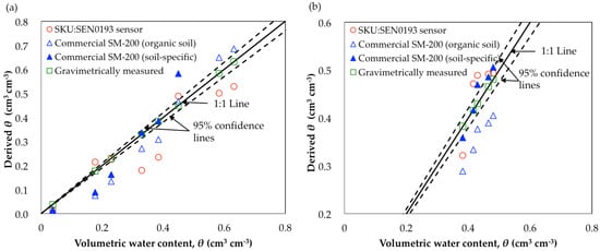 Soil samples were analyzed for their soil water content using the commercial available SM-200 sensor and the low-cost SKU:SEN0193 capacitive sensor. The volumetric water contents derived from the polynomial function of the SKU:SEN0193 sensor, the polynomial function of the SM-200 sensor for organic soil (manufacturer’s function), and the soil-specific calibration (the function obtained from the measured coefficients) are plotted in Figure 4 as a function of the measured volumetric water content. The root-mean-square error (RMSE) was calculated for the soil water contents derived by the different calibration (polynomial) functions. The RMSE values of the SKU:SEN0193 sensor function, the SM-200 manufacturer’s function, and the SM-200 soil-specific calibration function were 0.09, 0.07, and 0.06 cm3 cm−3, respectively, for the samples with dry to saturated levels of soil water content. The soil water content at 0.45 cm3 cm−3 (74% gravimetric water content) was predicted precisely by the derived polynomial functions of both sensors (Figure 4a). Hence, data prediction at the field capacity (a gravimetric water content of 60–80%) was performed by measuring the moisture-adjusted samples (Figure 4b). The RMSE was calculated as before. The RMSE values of the SKU:SEN0193 sensor function, the SM-200 manufacturer‘s function, and the SM-200 soil-specific calibration function were 0.05, 0.08, and 0.03 cm3 cm−3, respectively, in the field capacity range. The data prediction ability of the sensor appeared similar to that of the SM-200 sensor (with soil-specific calibration) at a lower investment cost. This study highlights the potential use of the low-cost SKU:SEN0193 capacitive moisture sensor for predicting the water content of soil.