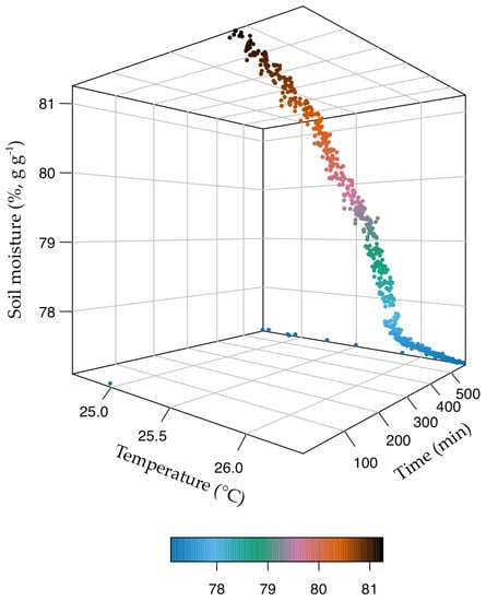 Prior to deploying the system in the field, it is necessary to evaluate the performance of the derived function for continuous operation. Thus, soil moisture loss from a sample in the field capacity range was evaluated using the derived polynomial function (gravimetric basis) (Figure 5). The experiment was performed for 12 h, from day to nighttime, under laboratory conditions. The room temperature and the relative humidity of the room ranged from 25 to 26 °C and 72 to 75%, respectively, during the measurements. The 3D scatter-plot in Figure 5 illustrates the soil moisture loss with time. It shows a gradual decrease in soil moisture during 12 h of measurements.
