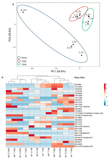 (A) Principal component analysis (PCA) score plot of secondary metabolites (SMs) produced by A1021B under different growth conditions. (B) Heat map illustrating the abundance of the main SMs in A1021B cultures, visualized through the color scale reported on the right. Each row represents differentially abundant products ordered by their mass (Da), while columns correspond to the different culturing conditions. MK = maize kernels; CDB = Czapek-Dox broth; PDB = potato dextrose broth; d = darkness; l = light; 1 w = 1 week; 2 w = 2 weeks.