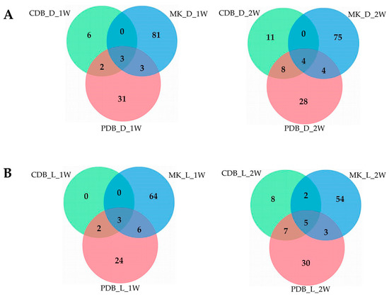Venn diagrams showing the number of unique and overlapping products in A1021B cultures under the different growth conditions. (A) Secondary metabolites (SMs) produced in darkness (d) after one (1 w) or two weeks (2 w). (B) SMs produced under light exposure (l) after one (1 w) or two weeks (2 w). MK = maize kernels; CDB = Czapek-Dox broth; PDB = potato dextrose broth.