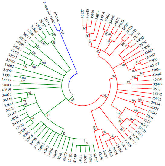 - Kumar, S.; Stecher, G.; Tamura, K. MEGA7: Molecular Evolutionary Genetics Analysis Version 7.0 for bigger datasets. Mol. Biol. Evol. 2016, 33, 1870–1874. [Google Scholar] [CrossRef] [PubMed]