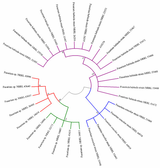 Phylogenetic relationships of strain A1021B were investigated on account of CAL1, TEF1 and TUB2 sequences as reported in [15]. DNA sequences were blasted against the NCBI GenBank database using default parameters and then aligned with isolates belonging to the FIESC [15,41] and Fusarium babinda by the Clustal W algorithm [42] with MEGA7 software [43]. Phylogenetic trees were inferred using the maximum likelihood method based on Tamura-Nei model applied to the whole set of manually edited aligned sequences. The confidence of the branching was estimated by bootstrap (BP) analysis (1000 BP). A strain of Fusarium concolor was used as outgroup for rooting the phylogenetic tree. DNA sequences of the three loci were submitted to GenBank, with the following accession numbers: MK968883 (ITS), MK984207 (CAL1), MK984206 (TEF1), and MK984208 (TUB2).