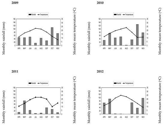 Field experiments were conducted in 2009, 2010, 2011, and 2012 in the Technological Education Institute farm of Florina, Greece (40°46′ N, 21°22′ E, 705 m a.s.l.). The soil type was Sandy Loam (SL): Sand 61.2%, Silt 27.6%, Clay 11.2% with pH 6.25, and organic matter content 1.29%. Environmental data (mean monthly temperatures in °C and rainfall in mm) based on daily records are presented in Figure 1.