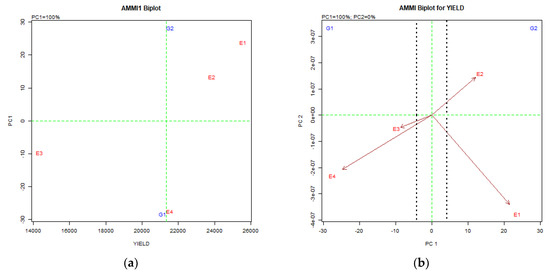 AMMI Biplot for genotypes (G) and years (E) for yield and separation of genotypes for yield favoring years. (a) The contribution on variance of the factor of years in the treatment of yield (E) the year E2 and E3 gives a small amount on variance whereas E1 and E4 are the most diverse years producing variance over the genotypes G1 and G2 for the variable of yield. (b) The deviation of years from the ideal year, E3 has the smaller deviation of the ideal year on yield; the favorable years for G1 are the E3 and E4 whereas the favorable years for G2 are the E1 and E2.