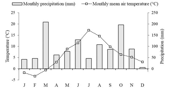 The study area was located in the territory of Castelluccio di Norcia (42°49′ N, 13°13′ E; central Italy), inside the Monti Sibillini National Park, and within the Natura 2000 site of “Site of Community Importance” IT5210052 “Piani di Castelluccio di Norcia”, which includes two main priority grassland habitats (habitat code 6210* and 6170; EU Habitat Directive, Annex I). The bedrock of the study area is calcareous, and the climate is temperate oceanic, characterized by an annual mean temperature of 8.2 °C and mean precipitation of 867 mm, with the higher values in autumn and spring and the minima in summer [16]. The monthly mean air temperature and precipitation during the study period (January–December 2015) are shown in Figure 1. The area is characterized by a low-input cropping system. The main crops for these grassland-dominated landscapes, which are mostly used for summer grazing by cattle or transhumant flocks [17], are winter cereals, including emmer (Triticum turgidum L. ssp. dicoccum (Schrank) Thell.), oat (Avena sativa L.), and legumes, mainly lentil (Lens culinaris Medik.).