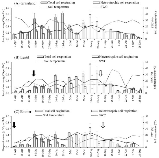 Seasonal variations of the soil and heterotrophic respiration, and the soil water content (SWC) and soil temperature (as indicated), for the three cultivation types of permanent grassland (A), lentil (B) and emmer (C). SWC was defined at 20 cm in depth; soil temperature was defined at 10 cm in depth. Vertical bars represent standard errors. Black arrow, sowing date; white arrow, harvesting date, for lentil and emmer cultivation.