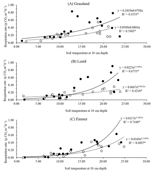 Relationships between the variations of the total (closed circles, full line) and heterotrophic (open circles, dashed line) respiration and the soil temperature (at 10 cm in depth) for the grassland (A), lentil (B), and emmer (C) experimental fields. Data are means of three plots per field. * p < 0.05.