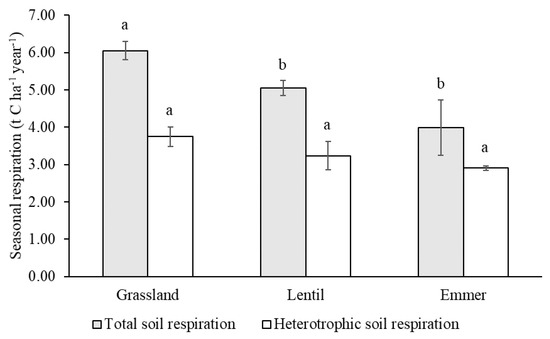 In the present study, significant differences were seen between the cumulative total soil respiration rates for the grassland (6.05 t C ha−1 year−1) over lentil (5.05 t C ha−1 year−1) and emmer (3.99 t C ha−1 year−1) (Figure 4) supporting the findings of [28], who reported that soil respiration of temperate mountain grasslands is amongst the highest reported for any type of ecosystem.