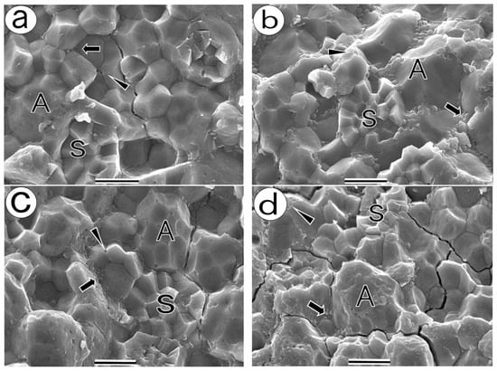 Accumulation structures of rice grain in selected varieties: (a) Attai-1, (b) Jalalabad-14, (c) Shishambagh-14, and (d) Zodrass. A: amyloplast; S: starch granules; arrow: protein bodies; arrowhead: traces of protein bodies. Bars: 10 µm.