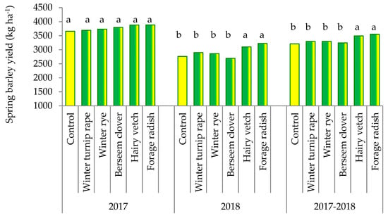 The effect of cover crops on the yield of spring barley (kg ha−1) in 2017 and 2018, and the average of these years compared to the control (without cover crop). Within years, bars marked with different lowercase letters indicate significant differences at p < 0.05 according to the Fisher’s LSD test.