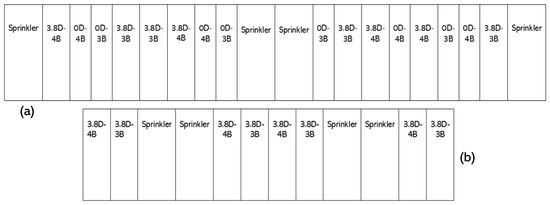 The fall (a) and winter (b) experiment layouts (not to scale). Sprinkler: treatment irrigated by sprinklers; 3.8D-3B: treatment with three driplines in each bed installed at 3.8 cm depth; 3.8D-4B: treatment with four driplines in each bed installed at 3.8 cm depth; 0D-4B: treatment with four driplines in each bed on the soil surface; 0D-3B: treatment with three driplines in each bed on the soil surface.