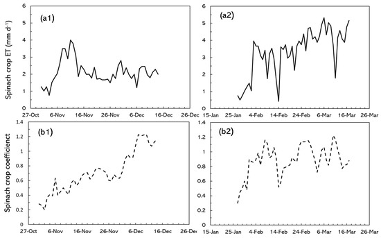 Daily spinach crop evapotranspiration or ET (a1,a2) and crop coefficient (b1,b2) values in the experimental seasons. The subfigures a1 and a2 show crop ET in the fall and spring trials, respectively, and the subfigures b1 and b2 show crop coefficient values in the fall and spring experimental seasons, respectively.