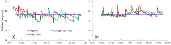 Soil water storage at the surface to a 45 cm-deep profile at the drip (3.8–4B) and sprinkler treatments in the fall (a) and winter (b) crop seasons. The blue line shows the soil water storage calculated using an average field capacity of the top 45 cm of the soil (0.43 m3 m−3).