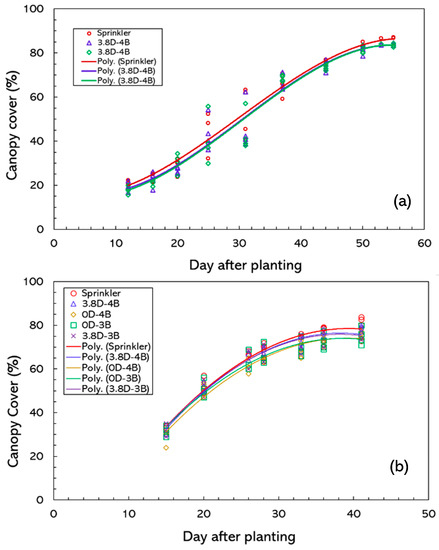 Crop canopy cover is defined as the percentage of plant material which covers the soil surface, and can be a very useful index for estimating the crop coefficient. Here, the canopy cover percentage was developed for each of the irrigation treatments (Figure 6). Canopy cover percentages show that the leaf density of drip irrigation treatments was slightly behind (1–4 days depending upon the irrigation treatment and crop season) than that of the sprinkler irrigation treatments.