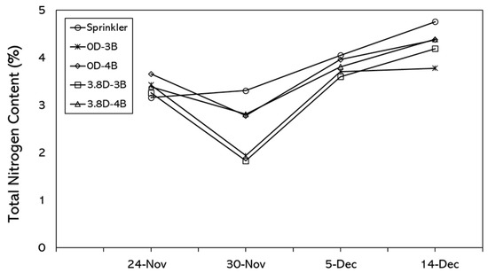 Few differences between drip and sprinkler treatments were visible for the winter planted trial, while more differences were observed in the fall experiment in November. Leaves began to yellow in between the drip laterals in plots with the three-dripline treatments. A possible reason for this may be that the fertigation did not move the N in between the driplines. The total plant tissue N content of the drip treatments with three driplines in bed was less than the sprinkler treatment on the 30th of November (1.8% N for the drip vs. 3.2% N for the sprinkler), while the difference in N content of the tissue was less between the sprinkler treatment and the drip treatment with four driplines in the bed (Figure 7). Overall, a higher plant-tissue nitrogen content was observed for the sprinkler treatment compared to drip treatments.