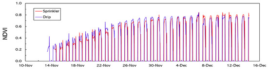 NDVI values of sprinkler and drip (3.8D-4B) treatments over the fall crop season. The daily values vary between a maximum during daytime and zero during nighttime.