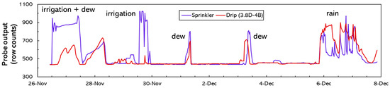 Figure 10 shows the probe output of the leaf wetness sensors placed in the sprinkler treatment and drip treatment (3.8D-4B) for a period of 12 days during the fall season experiment. At this period, there were two irrigation events in each of the treatments, and two rainy days. The sensor output from dew was typically lower (less than 700 counts) than that from the rain or the irrigation event. The results revealed that sprinkler-irrigated crop canopies remained wet 24.3% (= (70 h/288 h) × 100) times longer during this period than the crop canopy irrigated with drip treatment.