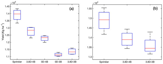 The effects of various irrigation treatments on spinach shoot biomass yield over the two experimental seasons are summarized in Table 2 and Figure 11. In the fall trial, the mean biomass yield in the sprinkler treatment was 13,905 kg ha−1, approximately 9% more than the 3.8D-4B treatment. The lowest mean yield (11,136 kg ha−1) was observed in the 0D-3B treatment. Statistical analysis indicated very strong evidence (p = 0.001) for an overall effect of the irrigation system on spinach yield. A significant difference between the individual treatments was investigated using the Tukey-HSD analysis. The results demonstrated a significant yield difference between the sprinkler irrigation and each of the drip irrigation treatments (p values of 0.0001 to 0.0009). Even though no significant yield difference was obtained between the surface drip and sub-surface drip (driplines at 3.8 cm depth) with the same dripline number in bed (p value of 0.8276 for the three-dripline and 0.1995 for the four-dripline), the number of driplines in bed had a very significant impact on spinach biomass yield (p values of 0.0001 to 0.0009).