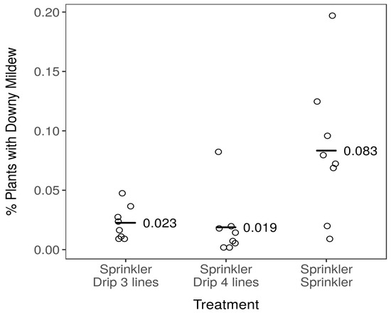 Analysis of means suggested that all three treatments were statistically similar. However, a pairwise comparison revealed some evidence that downy mildew incidence was lower in plots irrigated with 3.8D-4B (p = 0.0671) or 3.8D-3B (p = 0.1139) following emergence when compared to the sprinkler.