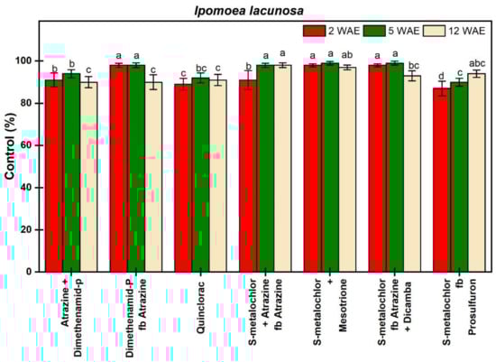Ipomoea lacunosa control with different herbicide treatments at 2, 5, and 12 weeks after emergence (WAE). Data were analyzed separately for each WAE. Data were pooled over three years. The same letters on bars indicate no significant differences at p < 0.05, according to Fisher’s least significant difference test. The abbreviation “fb” means “followed by”.