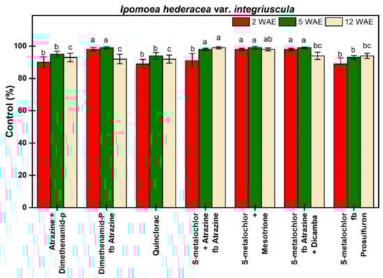 Ipomoea hederacea var. integriuscula control with different herbicide treatments at 2, 5, and 12 weeks after emergence (WAE). Data were analyzed separately for each WAE. Data were pooled over three years. The same letters on bars indicate no significant differences at p < 0.05, according to Fisher’s least significant difference test.