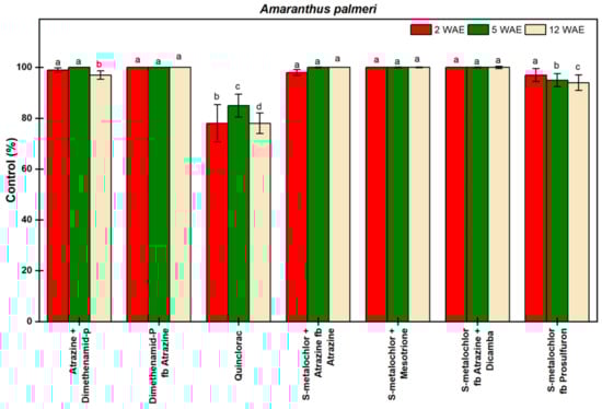 Amaranthus palmeri control with different herbicide treatments at 2, 5, and 12 weeks after emergence (WAE). Data were analyzed separately for each WAE. Data were pooled over three years. The same letters on bars indicate no significant differences at p < 0.05, according to Fisher’s least significant difference test.