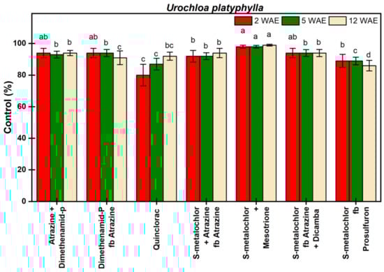 Urochloa platyphylla control with different herbicide treatments at 2, 5, and 12 weeks after emergence (WAE). Data were analyzed separately for each WAE. Data were pooled over three years. The same letters on bars indicate no significant differences at p < 0.05, according to Fisher’s least significant difference test.