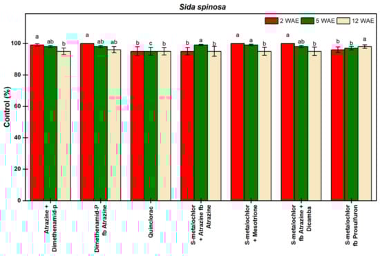 Sida spinosa control with different herbicide treatments at 2, 5, and 12 weeks after emergence (WAE). Data were analyzed separately for each WAE. Data were pooled over three years. The same letters on bars indicate no significant differences at p < 0.05, according to Fisher’s least significant difference test.