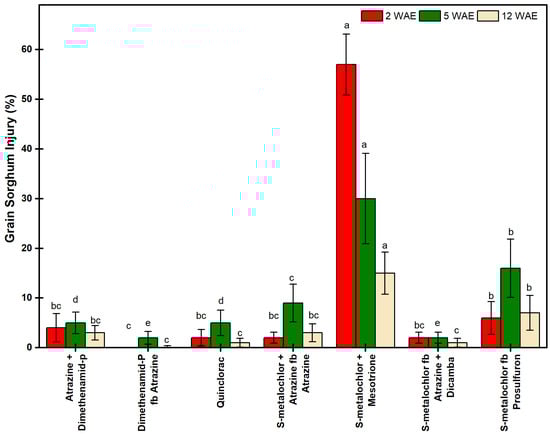 Injury to grain sorghum plants due to different herbicide treatments at 2, 5, and 12 weeks after emergence (WAE). Data were analyzed separately for each WAE. Data were pooled over three years. The same letters on bars indicate no significant differences at p < 0.05, according to Fisher’s least significant difference test.