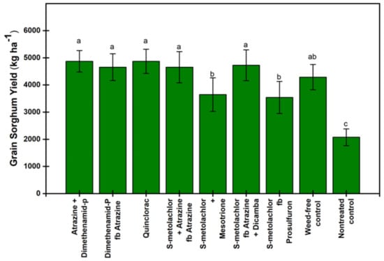 Grain sorghum yield as affected by different herbicide treatments. Data were pooled over three years. The same letters on bars indicate no significant differences at p < 0.05, according to Fisher’s least significant difference test.