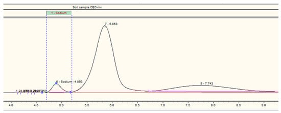 CEC of soil samples were measured by exchanging soil’s cations with sodium acetate []. CEC was estimated using 100 soil samples from both depths on the first (65 DAS) and the last FD (135 DAS), and only from 0–10 cm soil depth on the third FD (65 DAS). Samples were analyzed for sodium concentration using ion chromatography (Dionex ICS-5000+ DC-5 detector/chromatography module). No interference was observed among sodium and ammonium peaks (Figure 1), and values were corrected for actual concentration (cmol kg−1) by the following Equation;