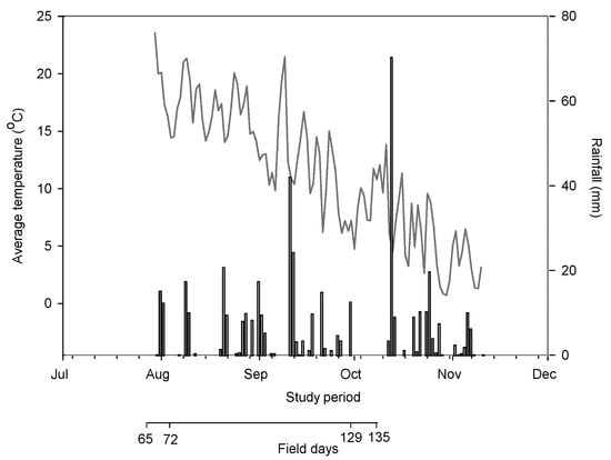 Mean average temperature (°C, solid line) and rainfall (mm, vertical bars) during the study period.