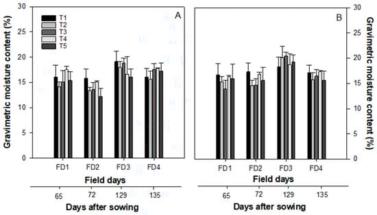 No significant effects of different soil amendments were recorded on gravimetric moisture contents of soil on each FD; however, the temporal variations were recorded, although non-significant at 0–10 cm (Figure 3A) and 10–20 cm (Figure 3B) soil depths. The gravimetric moisture contents varied from 12.24% to 19.12% at shallow soil depths (Figure 3A), whereas these values ranged from 13.90% to 20.48% at deep soil depth (Figure 3B).
