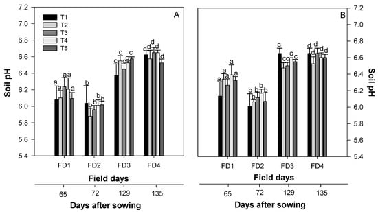 There was no significant difference (p > 0.05) for soil pH among nutrient management treatments within each FD at 0–10 cm (Figure 4A), and 10–20 cm soil depths (Figure 4B). However, significant (p < 0.05) temporal variations were recorded in soil pH across the four FDs on both soil depths where soil pH varies in order of FD1 > FD2 < FD3 < FD4 (Figure 4). It is also important to note that the soil pH initially decreased non-significantly from the first to the second FD, and thereafter increased significantly for all treatments except in the control treatment (T1—Figure 4B), reaching more favorable soil conditions for crop growth on last two FDs. Referencing the results for the soil pH, all treatments increased temporally (Figure 4A,B). Perhaps this may be attributed to the period of no rainfall from September 10 to 29. Biochar does increase soil pH, as demonstrated by the T3 plots; however, this was not significant as suggested by Chintala et al. [] and Molnár et al. []. As mentioned earlier, when soil pH increases, Al3+ precipitates as hydroxy-Al polymers, allowing more space for adsorption of other cations to the clay particle surfaces [].