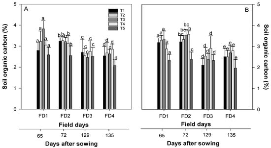 SOC varied non-significantly (p > 0.05) among the five studied nutrient management treatments within each FD at 0–10 cm soil depth (Figure 5A). However, T3 treatment comparatively had a higher amount of SOC on the FD1 (65 days after treatment application) compared to the other treatments. Significant (p > 0.05) temporal variations were observed in SOC in order of FD1 > FD2 > FD3 > FD4 (Figure 5A). Significant (p = 0.04) differences were recorded in SOC at 10–20 cm soil depth between T4 and T5 on FD2 (72 DAS) as depicted in Figure 5B. However, no-significant differences (p > 0.05) were found among the other treatments on FD1, FD3 and FD4 (Figure 5B). There were no significant temporal variations among all nutrient management treatments across all four FDs (Figure 5B). As observed at 0–10 cm soil depth (Figure 5A), T3 again had higher SOC values on FD1. However, T4 had higher SOC on all other FDs. T5 had the lowest SOC values throughout most FDs at both soil depths. These results follow the norm and suggest that SOC does not change within short time periods. SOC content varied from 1.27% to 4.58%, with an average value of 2.85% irrespective of treatment or field day in the experimental field. These values are typical of most agricultural soils in NL. SOC remained fairly constant for all treatments temporally, as was expected over the time frame of the experiment. The effect of biochar was slightly high for T3, as it initially had the highest SOC at both the 0–10 cm and 10–20 cm depths (Figure 5A,B). This was expected, as biochar has been shown to increase SOC [,]. T5, however, did not increase SOC, but rather decreased it, as it was lower than the control for most FDs. This (SOC) was significantly lower than T4 at the 10–20 cm depth on the second FD (72 DAS), indicating that the combination of DM + biochar, over a short period of time, decreases SOC. If the experiment was conducted over a longer time frame, this might be different. DM seems to increase SOC, as it had the highest SOC content for the 0–10 cm and 10–20 cm depth. This is expected, and consistent with the findings of Haynes and Naidu [] who also demonstrated that adding DM to soils does increase SOC.
