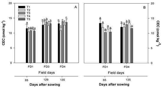 As a result, it is recommended to test CEC over long-term experiments []. CEC increased for all other treatments at the 0–10 cm depth (except for T2, which decreased on October 6). This may be attributed to the soil pH, as an increase in soil pH has been shown to increase CEC [].