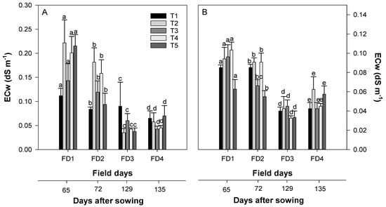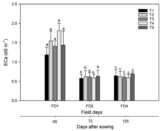 For the ECa values (only for 0–11 cm depth based on the probe length) obtained using the HD2 probe (IMKO GmbH, Germany), there was no significant difference among treatments (p > 0.05) within each field day. When referring to Figure 8, T4 had the highest value on the first field day (65 DAS). On the third and last FDs (129 DAS and 135 DAS), T5 had the highest value. ECa values also decreased significantly from FD1 to FD3 (day 2 data are not available for T2, T3, T4, and T5 and not included in this analysis). The field measured ECa shows the same trend as the laboratory measured ECw. This behavior clearly shows the reduction in ionic concentration of soil across the growing season due to nutrient uptake by plants, or losses due to leaching and volatilization [].