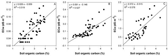Relationship between soil organic carbon and bulk electrical conductivity, ECa (A) at 0–10 cm depth, electrical conductivity of soil solution, ECw at 0–10 cm (B) and 10–20 cm (C) soil depths in podzolic soils under various nutrient management practices.