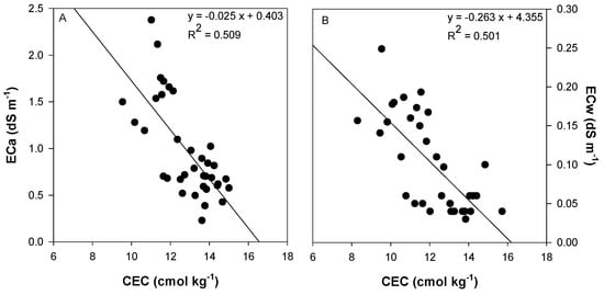 Relationship between cation exchange capacity and electrical conductivity of soil solution, ECw (A) and bulk electrical conductivity, ECa (B) at 0–10 cm soil depths in podzolic soils under various nutrient management practices.